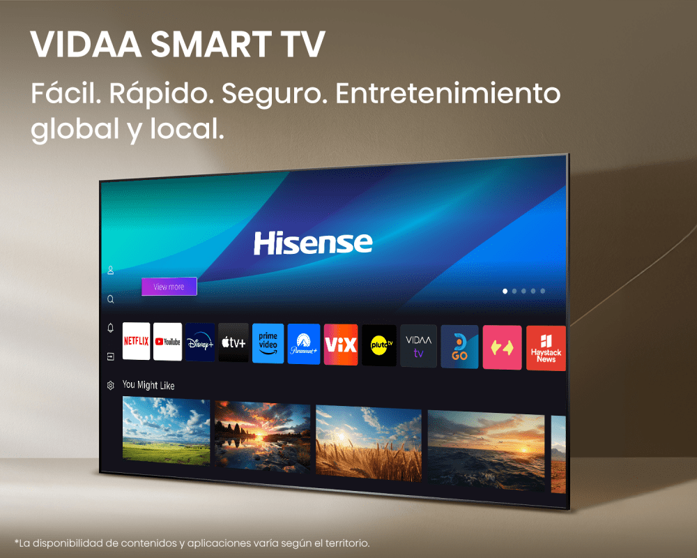 Equipado con el sistema operativo VIDAA, este televisor facilita el acceso a tus aplicaciones y plataformas de streaming favoritas con una interfaz rápida e intuitiva. Además, cuenta con conectividad Wi-Fi y Bluetooth, múltiples puertos HDMI y USB, y sonido envolvente para una experiencia de entretenimiento completa.